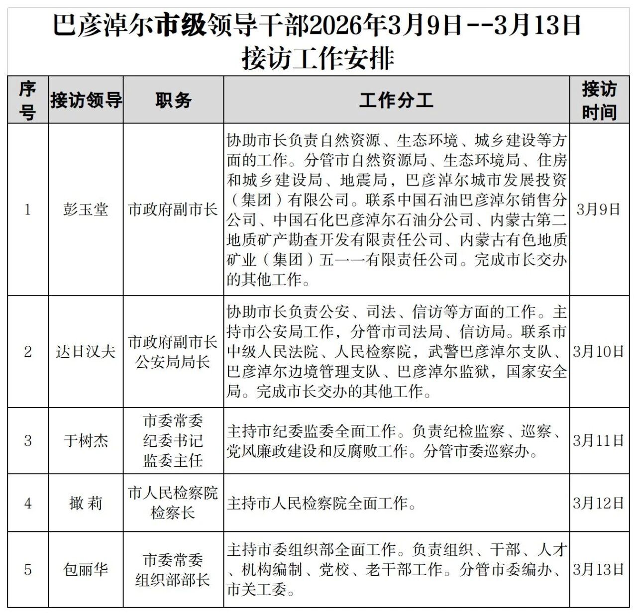 为深入学习贯彻习近平总书记关于加强和改进人民信访工作的重要思想,坚持和发展“枫桥经验”,牢固树立以人民为中心的发展思想,严格落实信访工作责任,扎实开展领导干部接访下访工作,依法及时就地解决群众合理诉求,维护全市经济社会大局和谐稳定,根据市委、市政府的安排部署,现就巴彦淖尔市2026年3月9日--3月13日市级领导干部接访安排公示如下: