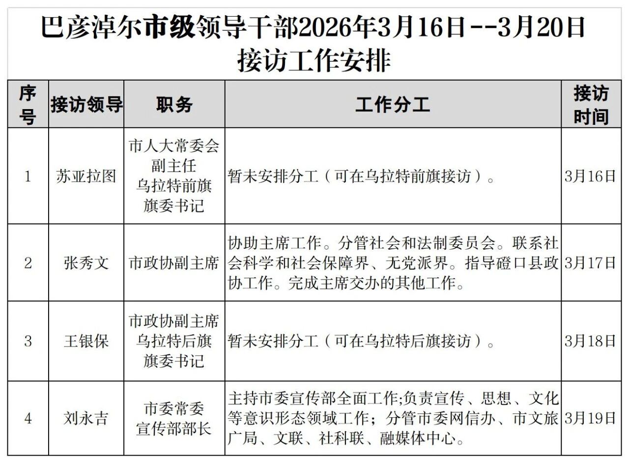 为深入学习贯彻习近平总书记关于加强和改进人民信访工作的重要思想,坚持和发展“枫桥经验”,牢固树立以人民为中心的发展思想,严格落实信访工作责任,扎实开展领导干部接访下访工作,依法及时就地解决群众合理诉求,维护全市经济社会大局和谐稳定,根据市委、市政府的安排部署,现就巴彦淖尔市2026年3月16日--3月20日市级领导干部接访安排公示如下: